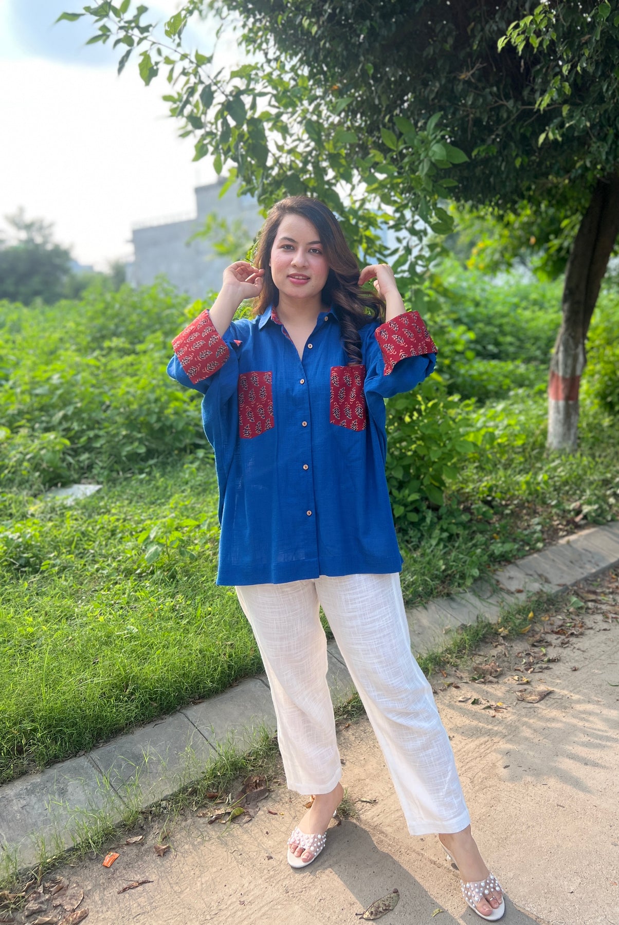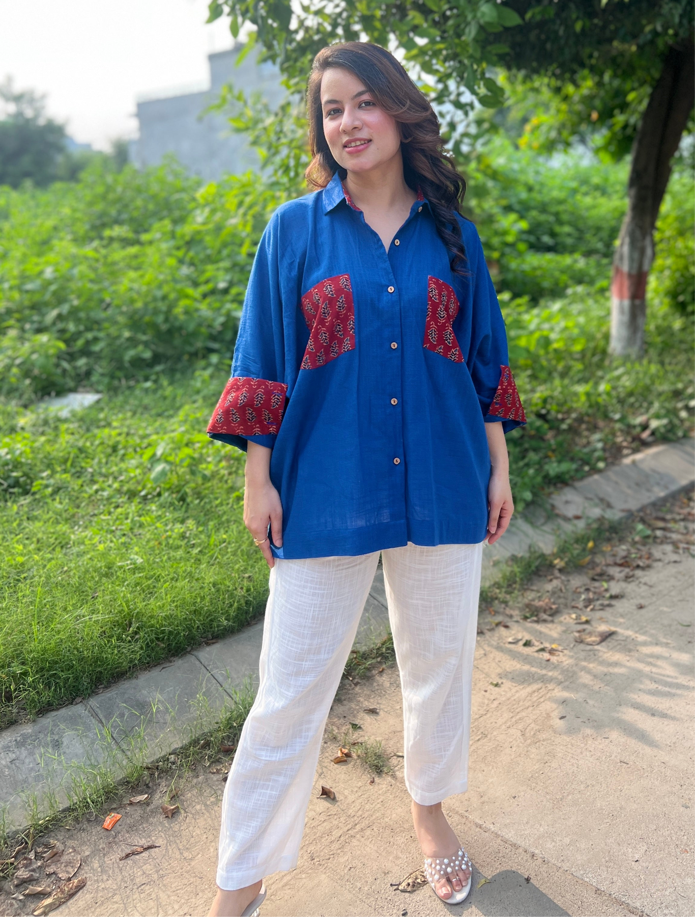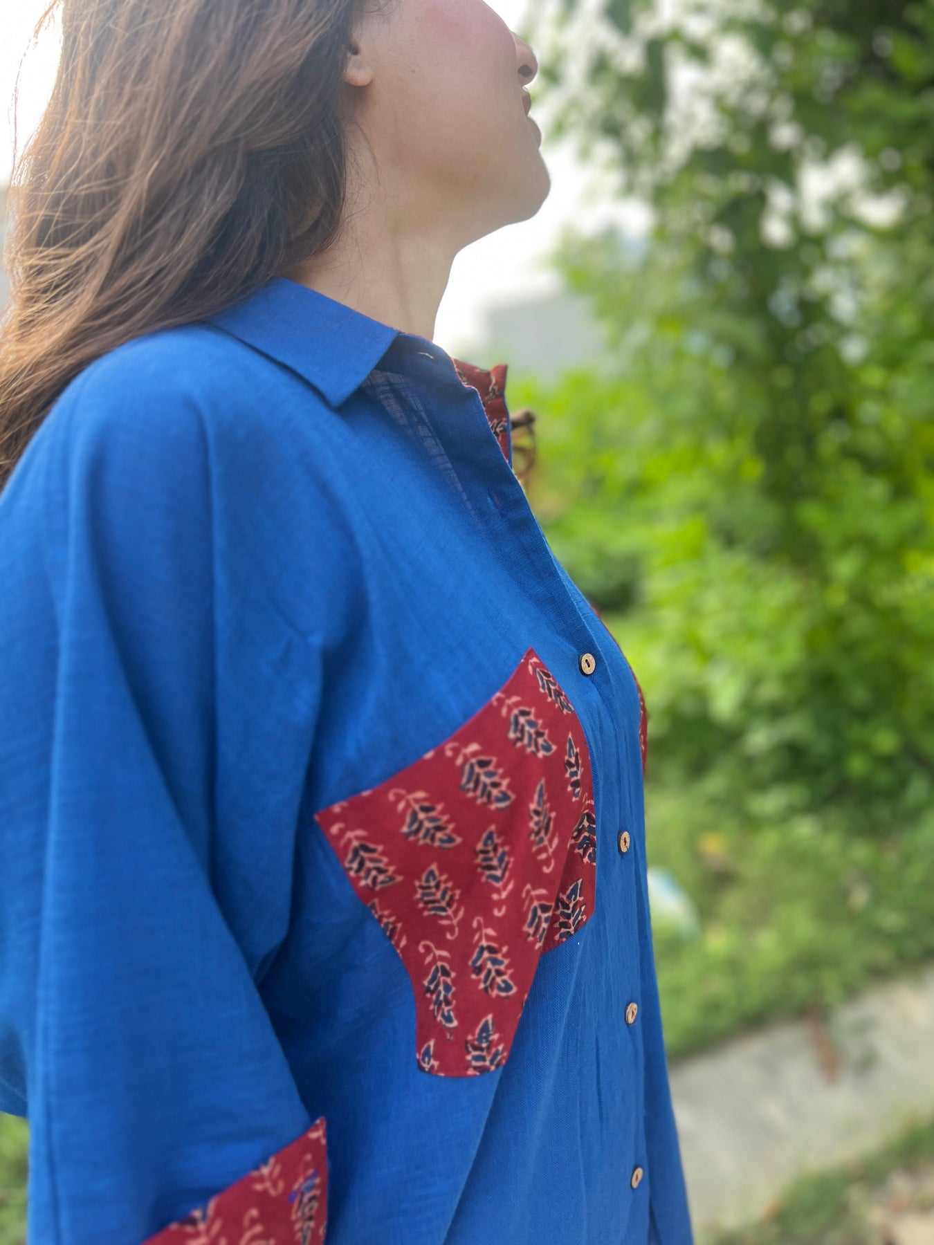 Comfortable kaftan style shirts with Ajrakh patching in cotton slub fabric. It has brown buttons for that perfect contrast