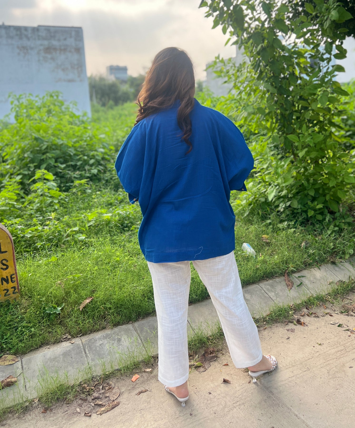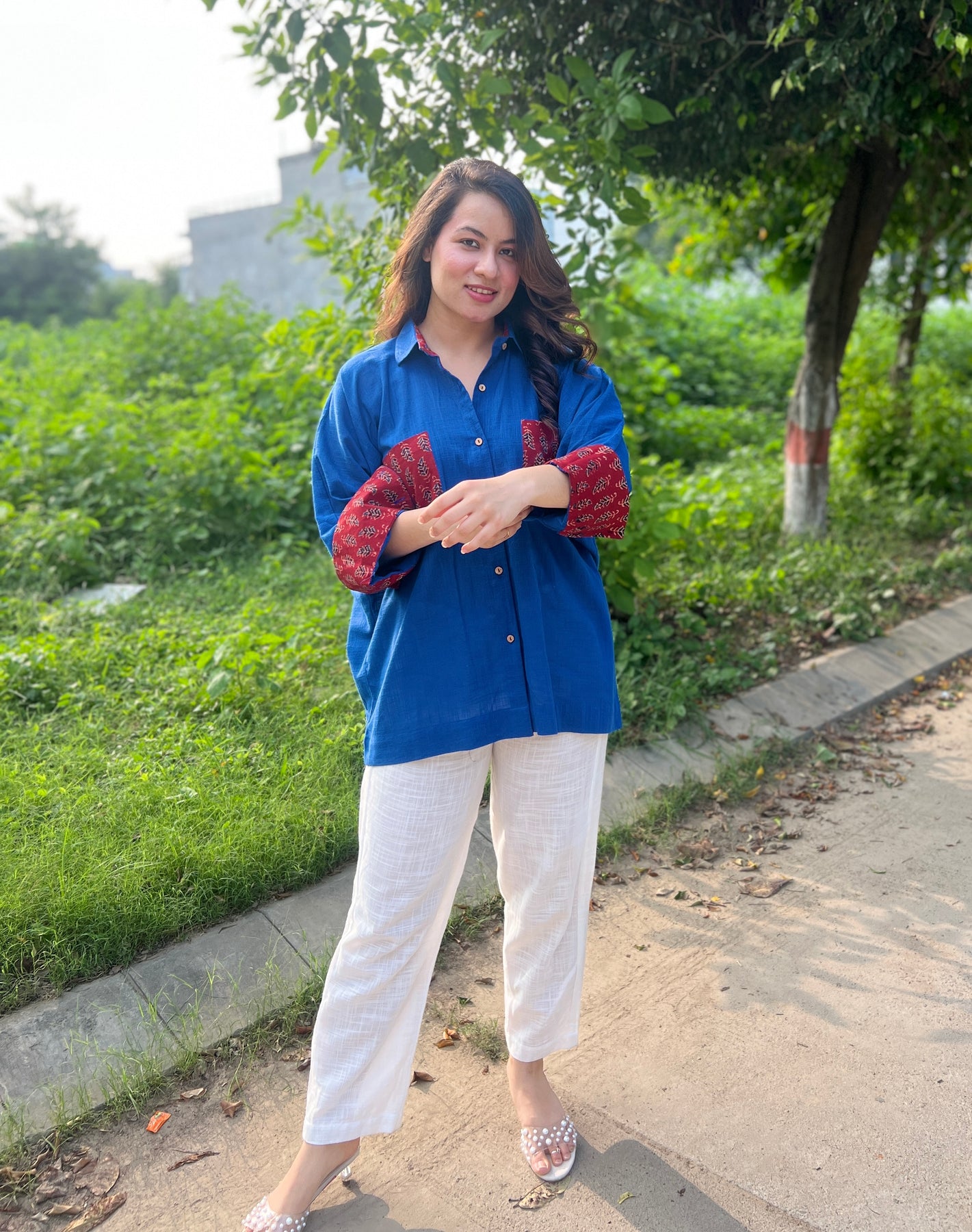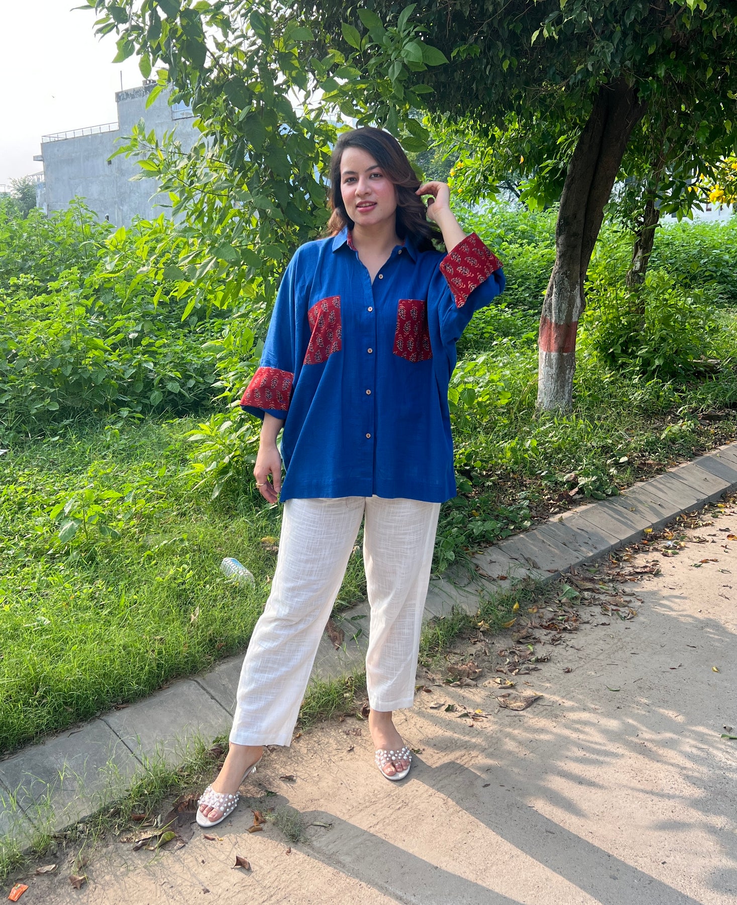 Comfortable kaftan style shirts with Ajrakh patching in cotton slub fabric. It has brown buttons for that perfect contrast
